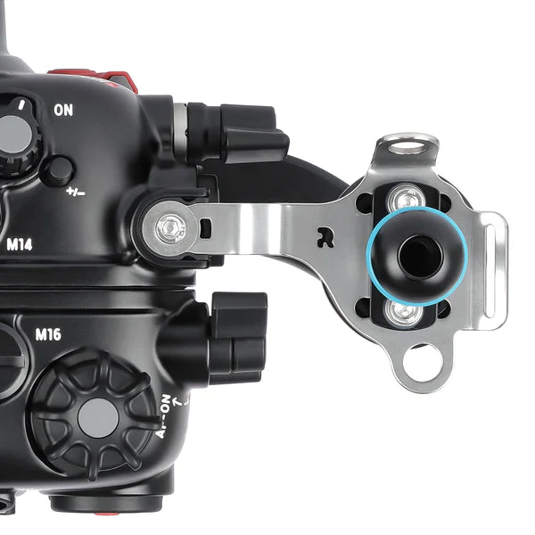 Front and rear control dials are readily accessible by the familiar large knurled dials at the right handle. The ergonomic housing handles are rubberized and feature stainless steel stiffening brackets to ensure a stable platform when using large strobes or video lights attached to the pre-installed 1" mounting balls.