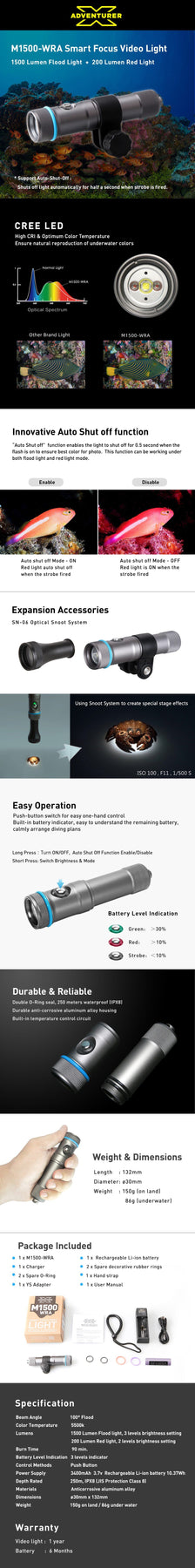 X-Adventurer M1500 WRA Smart Focus Video Light (Wide light + Red light + Auto-Shut-Off)