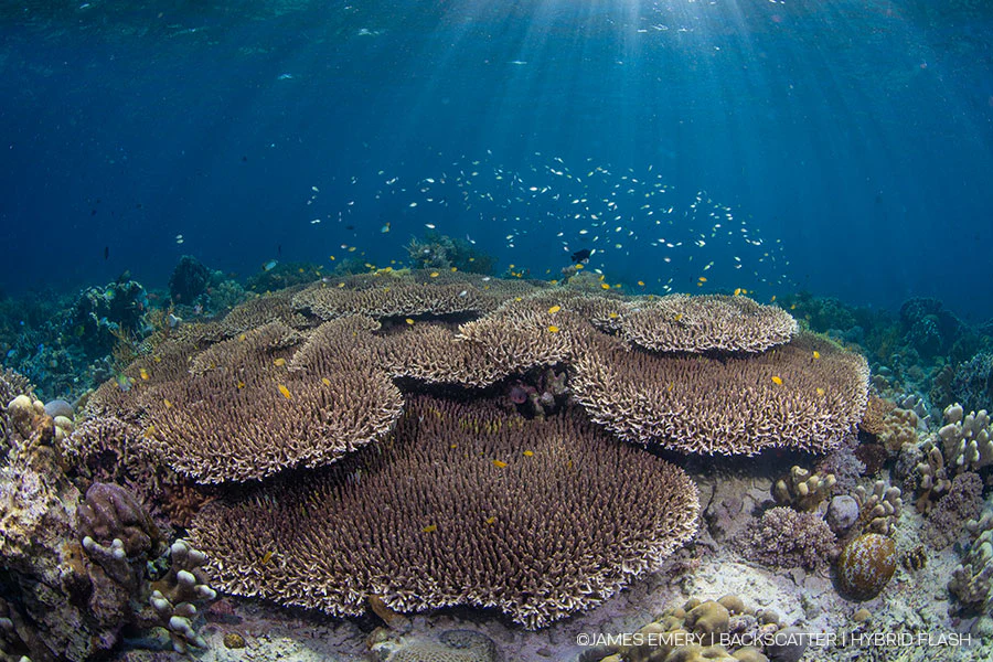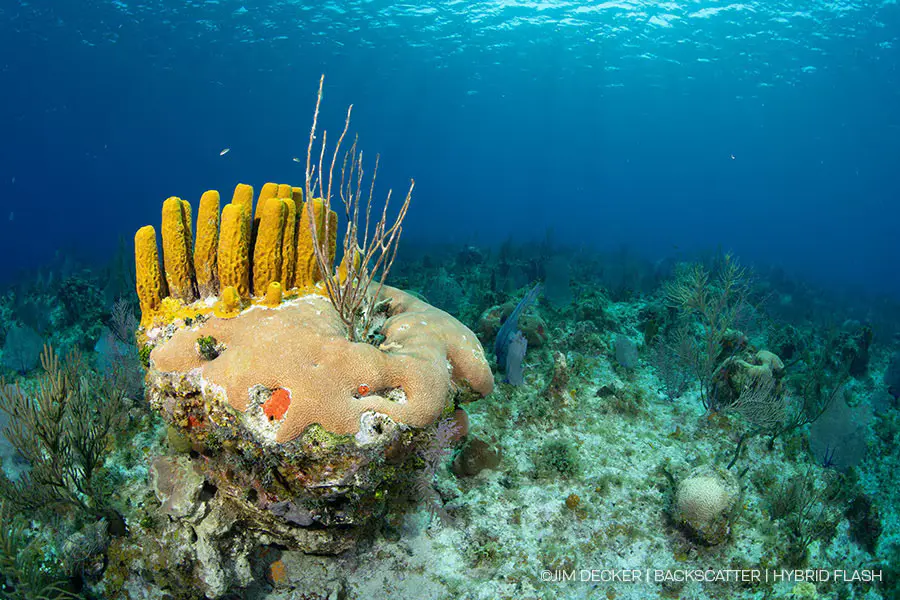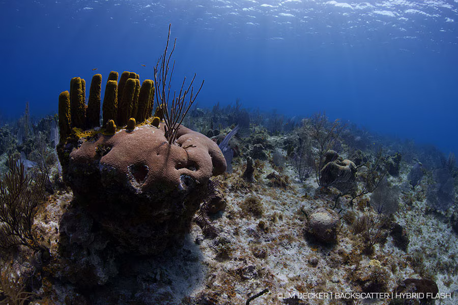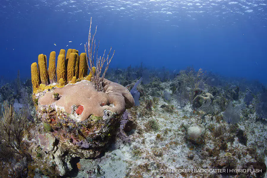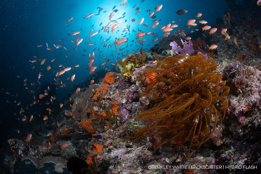 The powerful guide number ƒ40 flash beam will easily illuminate subjects in high ambient light environments. Shallow brightly lit reefs, sunballs, and big scenes are easier than ever to light. The brightness of the Hybrid Flash has plenty of reach for more distant subjects in a scene.
