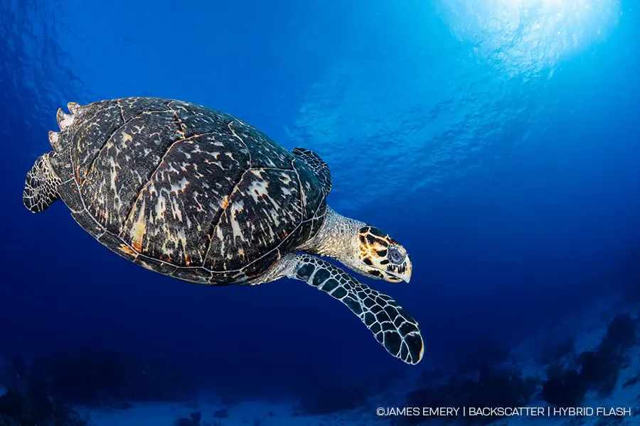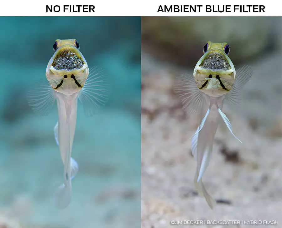 Traditional strobes use light that is significantly warmer than the much cooler blue light of the ocean. The Ambient Blue Filter matches the color temperature of the surrounding water, making the strobe match the color of the surrounding ambient light. When shot with the Ambient Blue Filter, the Hybrid Flash is filling shadows of the image, but not adding a different color to the scene. The Ambient Blue Filter is optimized for shooting at depths 10-35 feet.